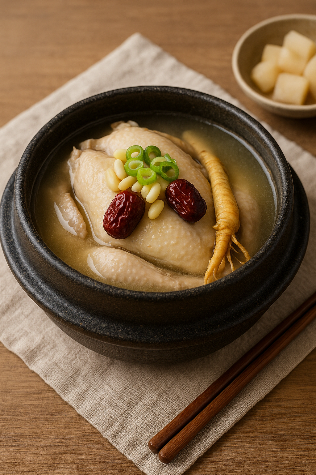 삼계탕은 찹쌀, 인삼, 마늘, 대추를 넣어 푹 끓인 대표적인 보양식으로,